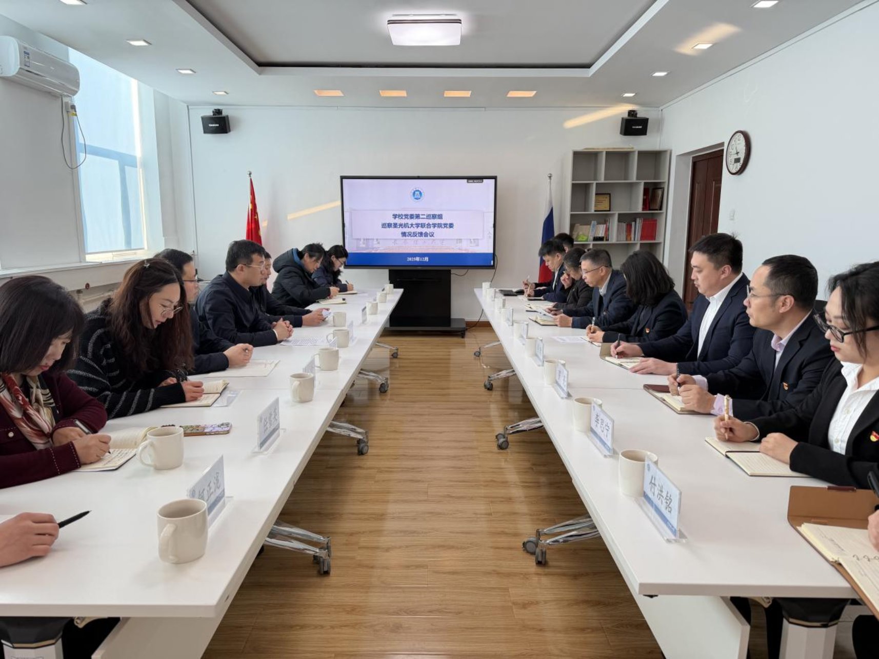按照长春理工大学党委巡察工作领导小组部署,2025年12月24日,党委第二巡察组向长春理工大学圣光机大学联合学院党委反馈巡察情况。第二巡察组组长董立泉同志传达了学校党委书记、巡察工作领导小组组长张宝宗同志关于巡察工作的指示精神,并就落实巡察整改任务提出明确要求。党委巡察办公室正处级巡察员、党委第二巡察组副组长张颜春同志代表巡察组向长春理工大学圣光机大学联合学院党委领导班子进行情况反馈。反馈会由长春理工大学圣光机大学联合学院常务副院长盛海涛主持,学院党委书记刘禹代表学院党委作表态发言。