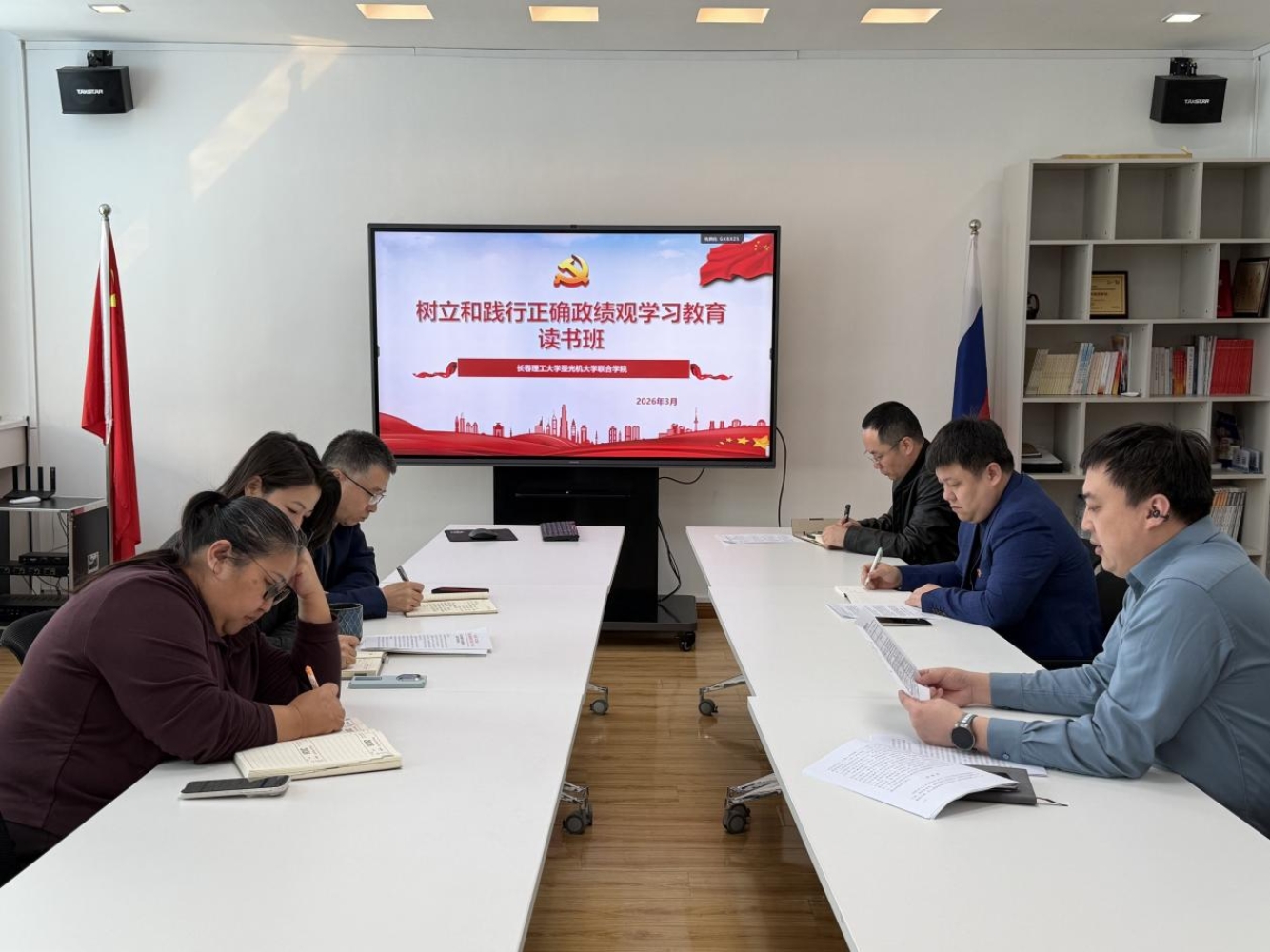 3月17日,长春理工大学圣光机大学联合学院党委在404会议室开展树立和践行正确政绩观学习教育读书班。会议由院党委书记刘禹主持,读书班成员参加学习。